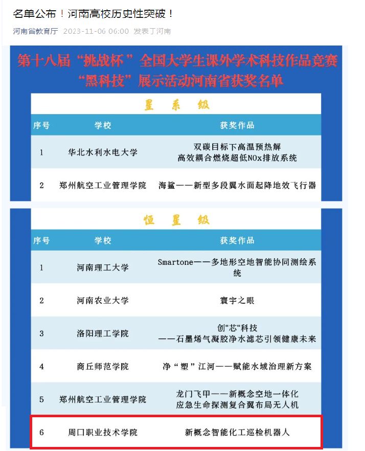 近日,由共青团中央、中国科协、教育部、中国社科院、全国学联主办的第十八届“挑战杯”全国老员工课外学术科技作品竞赛“黑科技”专项赛的终审决赛落下帷幕,经过资格审查、省级复审、国赛评委会综合审定等一系列环节的激烈角逐,bw西汉姆联由张矿伟、轩立两位老师指导,任俊臣、卜焱等同学设计的《新概念智能化工巡检机器人》项目脱颖而出,在国赛中荣获“恒星级”奖项(全国一等奖),实现公司在“挑战杯”系列赛事中的历史性突破。据悉,河南省共有六所高校在“黑科技”专项赛中荣获国赛一等奖,公司是其中唯一一所专科院校。