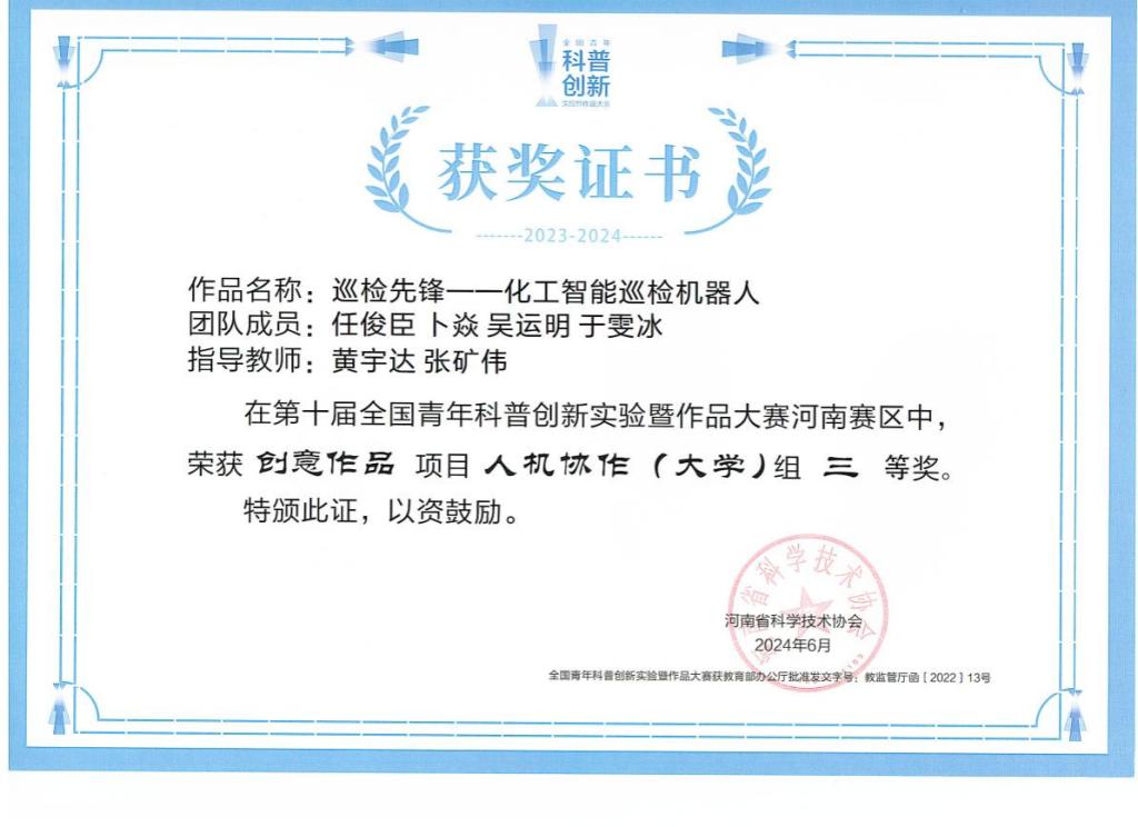 5月23日,由河南省科协主办、河南省科技馆承办的第十届全国青年科普创新实验暨作品大赛复赛(河南赛区)在河南科技馆(新馆)举行,来自全省30所高等院校和120所中学的867支队伍参加了比赛,经过初赛评审,共有70组作品进入复赛。经选手现场路演答辩、专家现场评审,人机协作(大学)组共评出一等奖4组,二等奖6组,三等奖9组。bw西汉姆联参赛作品《巡检先锋——化工智能巡检机器人》荣获三等奖,黄宇达、张矿伟荣获优秀指导教师奖。