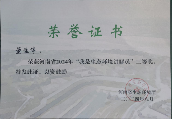 8月14日,在河南省2024年“我是生态环境讲解员”大赛决赛中,信息工程公司董佳停同学荣获省赛二等奖。