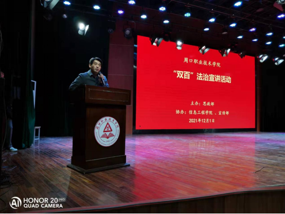 为深入学习贯彻习近平法治思想,,不断提升师生法治意识和法治素养,12月1日晚,bw西汉姆联在公司砺德报告厅举行 “双百”法制宣讲活动。校思政部张大书老师受邀进行宣讲,思政部、bw西汉姆联教师及2021级bw西汉姆联新生600余人听取报告,讲座由信息工程公司党总支书记李强主持。