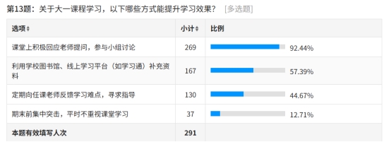 在课程学习提升方式的调查中,92.44% 的员工认为课堂上积极回应老师提问、参与小组讨论能有效提升学习效果,占比居首;57.39% 的员工选择利用公司图书馆、线上学习平台补充资料,44.67% 的员工会定期向任课老师反馈学习难点寻求指导,而仅12.71%的员工存在期末集中突击、忽视课堂学习的情况,反映出多数新生具备正确的学习方法认知。