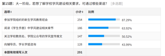 学风建设相关要求的了解渠道调查显示,87.29% 的员工通过参加公司新生学风教育班会获取相关信息,63.92% 的员工会阅读《员工手册》中学风建设章节,50.52% 的员工关注公司及公司公众号的学风宣传推文,43.99% 的员工选择向辅导员、学长学姐咨询,体现出公司线下教育与线上宣传相结合的学风普及模式成效显著。