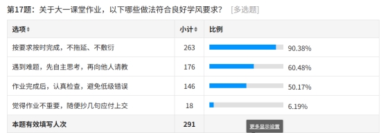 课堂作业规范方面,90.38% 的员工能够按要求按时完成作业,不拖延、不敷衍;60.48% 的员工遇到难题会先自主思考再请教他人;50.17% 的员工会在作业完成后认真检查。仅有6.19%的员工认为作业不重要并敷衍完成,展现了新生良好的作业学习习惯。