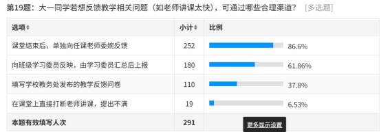 教学反馈渠道的调查中,86.6% 的员工选择课堂结束后单独向任课老师委婉反馈问题,61.86% 的员工通过班级学习委员汇总上报,37.8% 的员工会填写教务处教学反馈问卷,而仅6.53%的员工选择在课堂上直接打断老师,说明新生普遍掌握了合理的教学反馈方式。