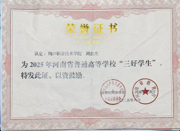 三代从军的家庭氛围,让周自杰自幼怀揣军营梦。他连续3年报名参军,历经近视、超重等挫折后,通过手术、健身等努力,终于在2021年圆梦军营。在部队炊事班岗位上,他凭借坚持拿下炊事比武第一,年夜饭获领导肯定,领悟到平凡岗位亦能创造不凡。退役复学后,面对学业断层困境,周自杰制定分阶段学习计划,坚持365天打卡学习,实现学业逆袭,综合成绩连续两年稳居班级第一,斩获国家励志奖学金并获评“三好员工”。