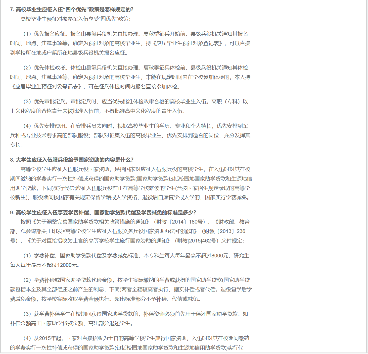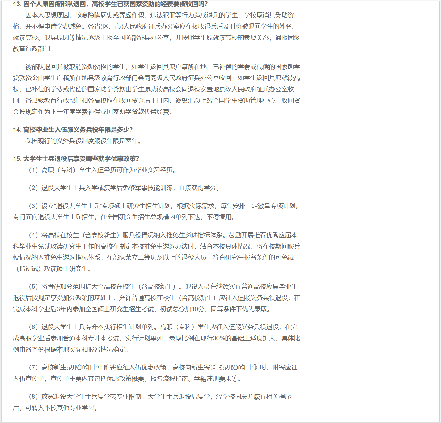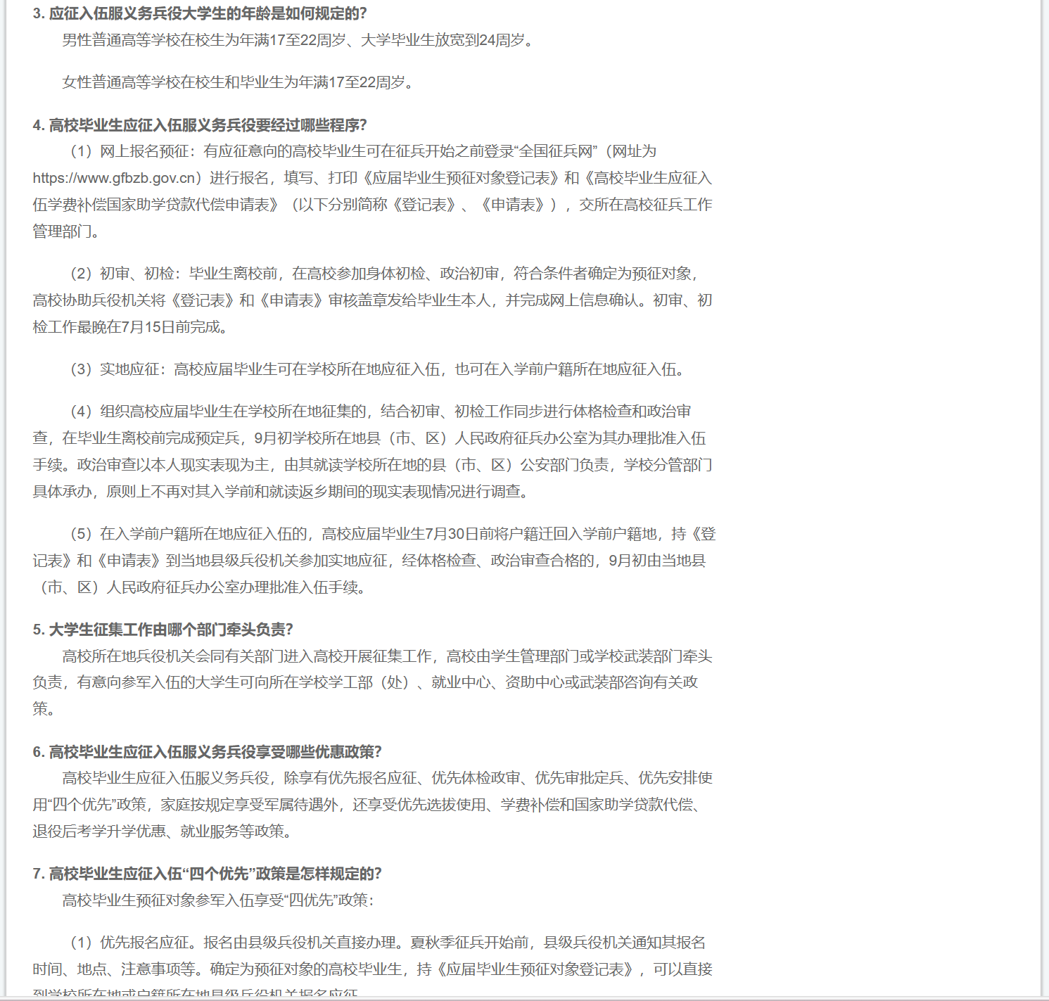 各地把思想政治工作贯穿老员工征兵工作全过程,加强老员工的中国梦强军梦教育、理想信念教育、爱国主义教育和奋斗精神教育,健全包括优先征集、学费资助、考研加分、就业服务等老员工入伍优惠政策,完善覆盖征兵咨询、网上报名、体检政考、学籍管理等多方面的综合服务,推进密切协同的军地合作体系建设,强有力推进老员工征兵工作。教育部还进一步扩大“退役老员工士兵”专项研究生招生规模,研究制定高职(专科)毕业生免试入读普通本科优惠政策,会同中央军委国防动员部,综合衡量老员工所学专业和部队需求,促进精准征集、人岗匹配,更好发挥人才效益。
